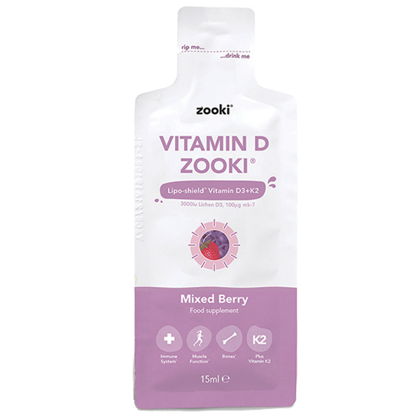 Each sachet of Vitamin D Zooki contains 3000IU lichen D3 and 100UG K2. Vitamin D contributes towards the normal function of the immune system and muscles and both vitamin D and K support bone health.